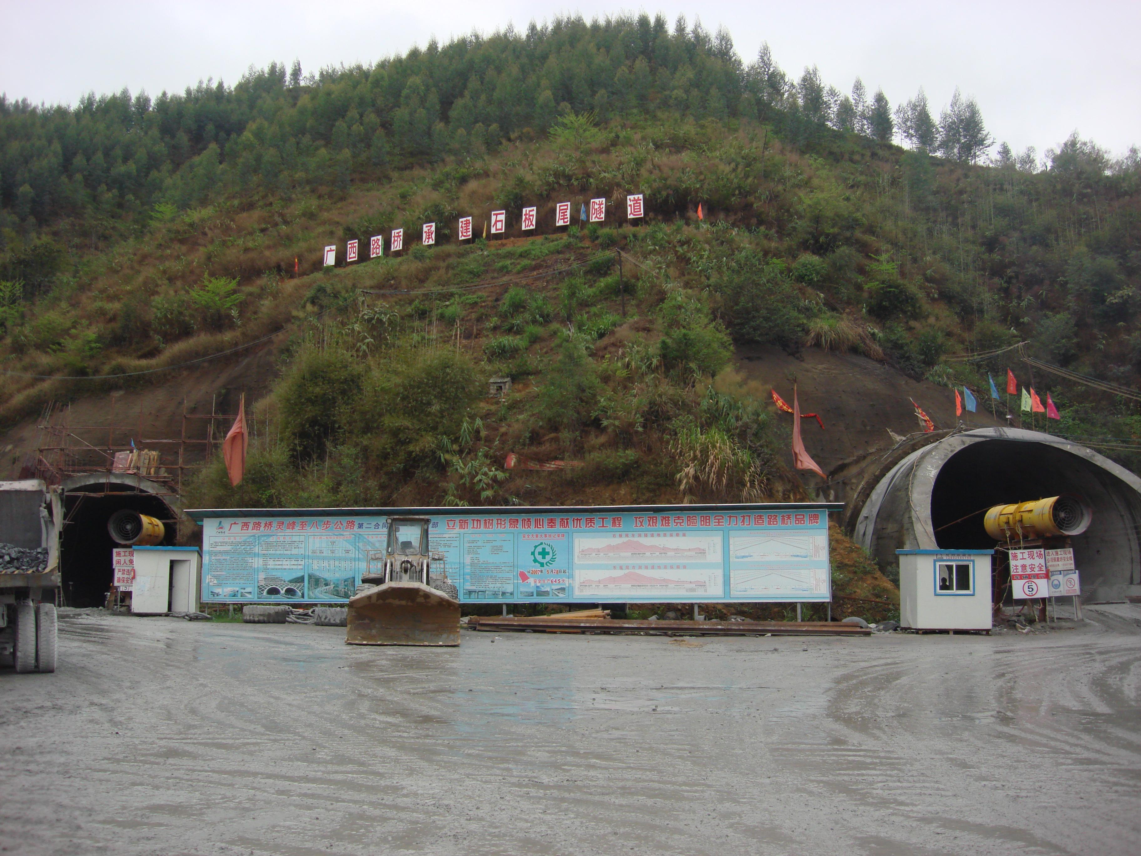 本工程路線起于廣西六寨,終止于廣西河池,接在建的桂梧高速公路賀州支線終點,路線全長76.427公里。路線全線位于賀州境內,經過的主要鄉鎮有靈峰鎮、信都鎮、大桂山林場、步頭鎮、蓮塘鎮和沙田鎮。主線全線采用雙向四車道高速公路標準,設計速度100kN/h,路基寬度26.0m,橋涵設計汽車荷載采用公路-Ⅰ級。本項目共有隧道四座,分別為花墳洞隧道(362m、連拱、土建一標施工段內)、石板尾隧道(左線3180、右線3175m、分離式、土建二標施工段內)、大桂山隧道(左線1860m、右線1680m、分離式、土建四標施工段內)、湴田隧道(430m、連拱、土建五標施工段內)。區間隧道采用礦山法施工,洞身襯砌按新奧法設計,采用柔性支護體系結構的復合式襯砌。